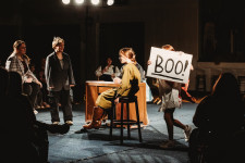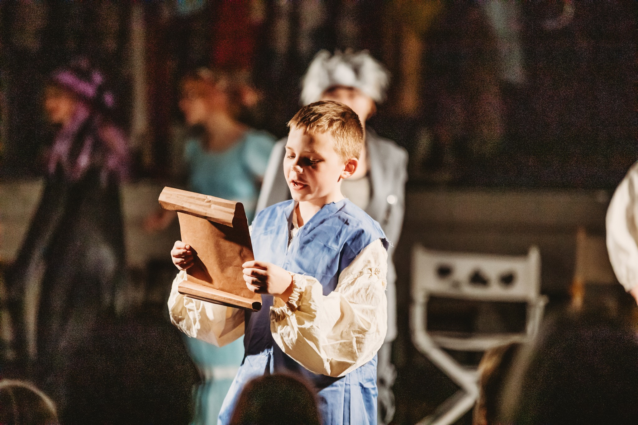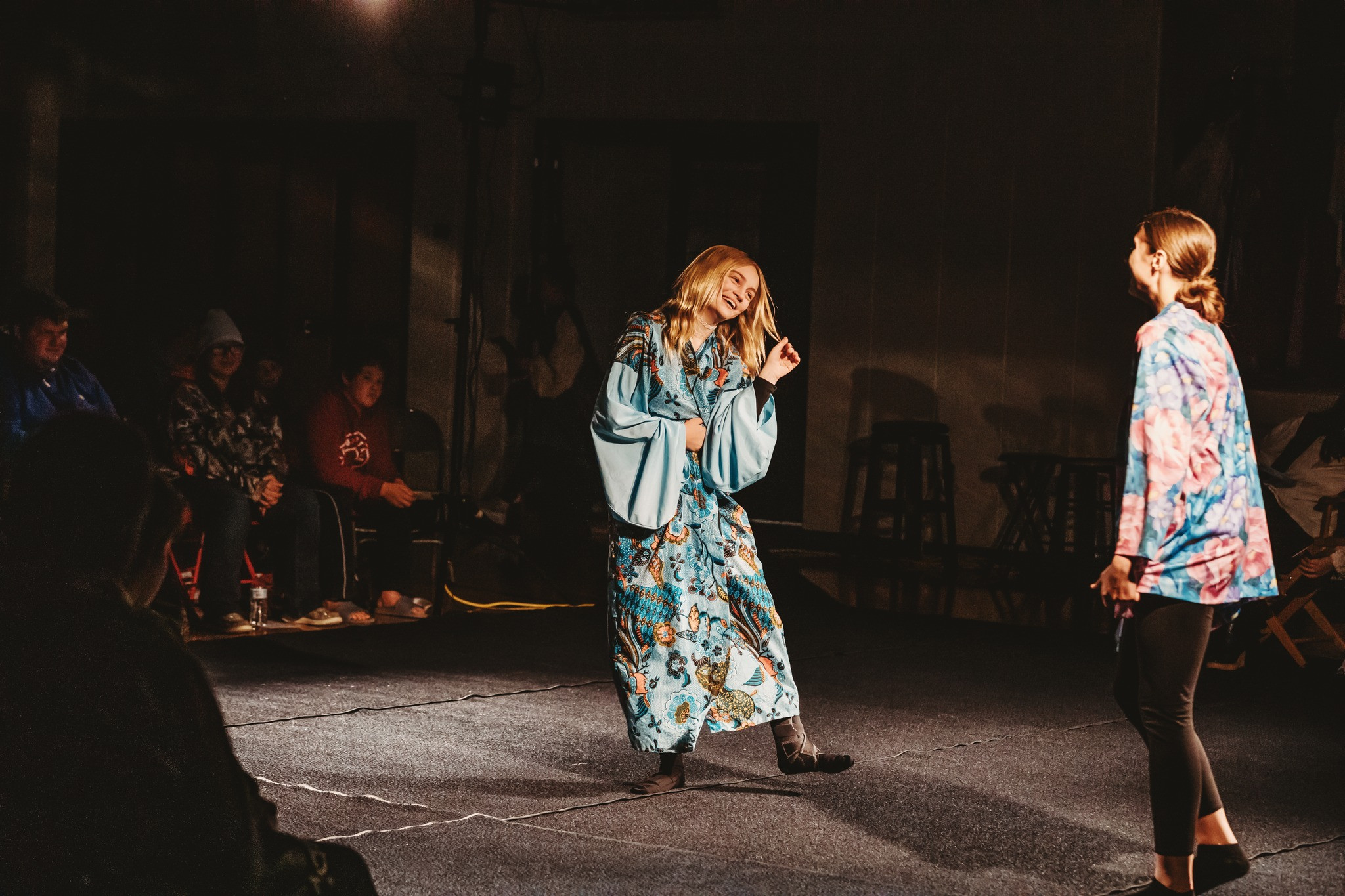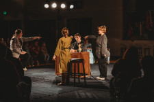 We decided to try something different and perform the play in-the-round, audience on 3 sides on the gym floor, lights in the corners and on the stage we placed clothes racks that held many costumes that they changed behind. We wanted to be close to the audience for the interactions, made for a very simple set, and gave a new perspective, one the new superintendent was very impressed with. I had students from 6th grade to 12th, and this vehicle gave challenges to some and more manageable parts for less experienced or confident actors.